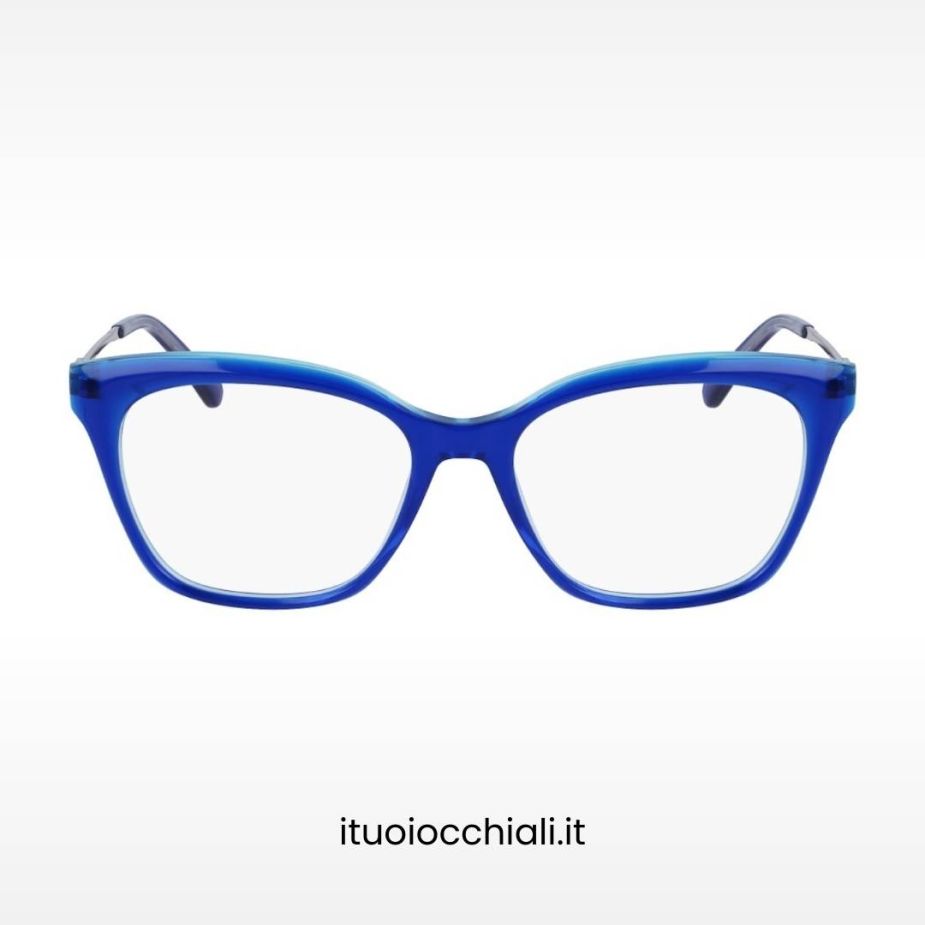 Questa montatura in acetato dall’ampia forma squadrata presenta un elegante contrasto di colori: esternamente è di un vivido blu, mentre internamente è di un delicato azzurro chiaro. Questa combinazione di colori crea un interessante effetto visivo e aggiunge un tocco di luminosità al design complessivo della montatura.